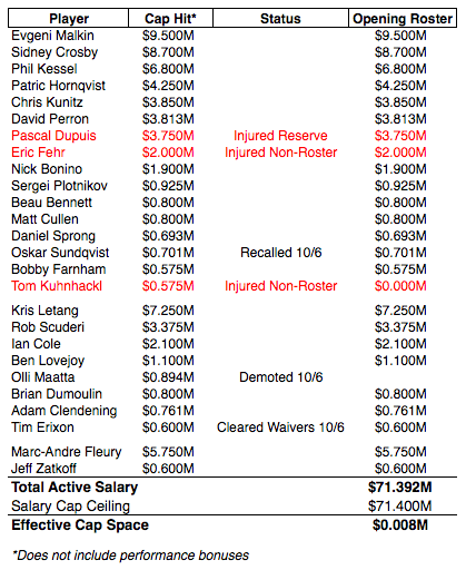 Here is the Penguins’ opening day roster and cap situation, ignoring the impact of performance bonuses: