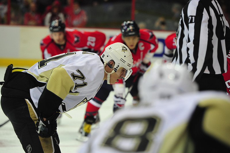 WSH Left Wing: Help the defenseman guard the front of the net. He skates out to confront Kris Letang (58) if the faceoff is won to that side of the ice. If the Caps win the faceoff, he goes directly to the left boards to give his defenseman a passing option on the developing breakout.
