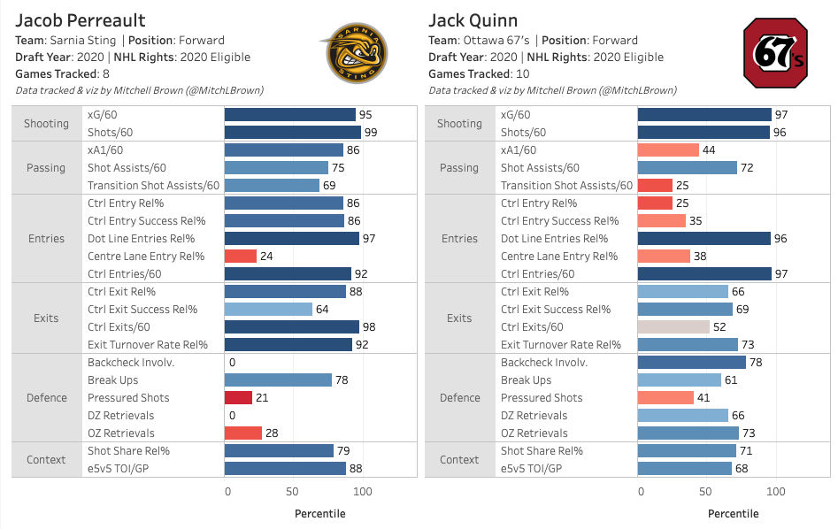 The Sting’s struggles help put Perreault’s team worst minus-34 plus/minus into context. He was used in all situations and he was often overwhelmed, but it is not an indication that he is a poor two-way player. He certainly has room to improve, but he is not as one-dimensional as Quinn. A glimpse at the tracking data from Mitchell Brown comparing Perreault and Quinn is enlightening.