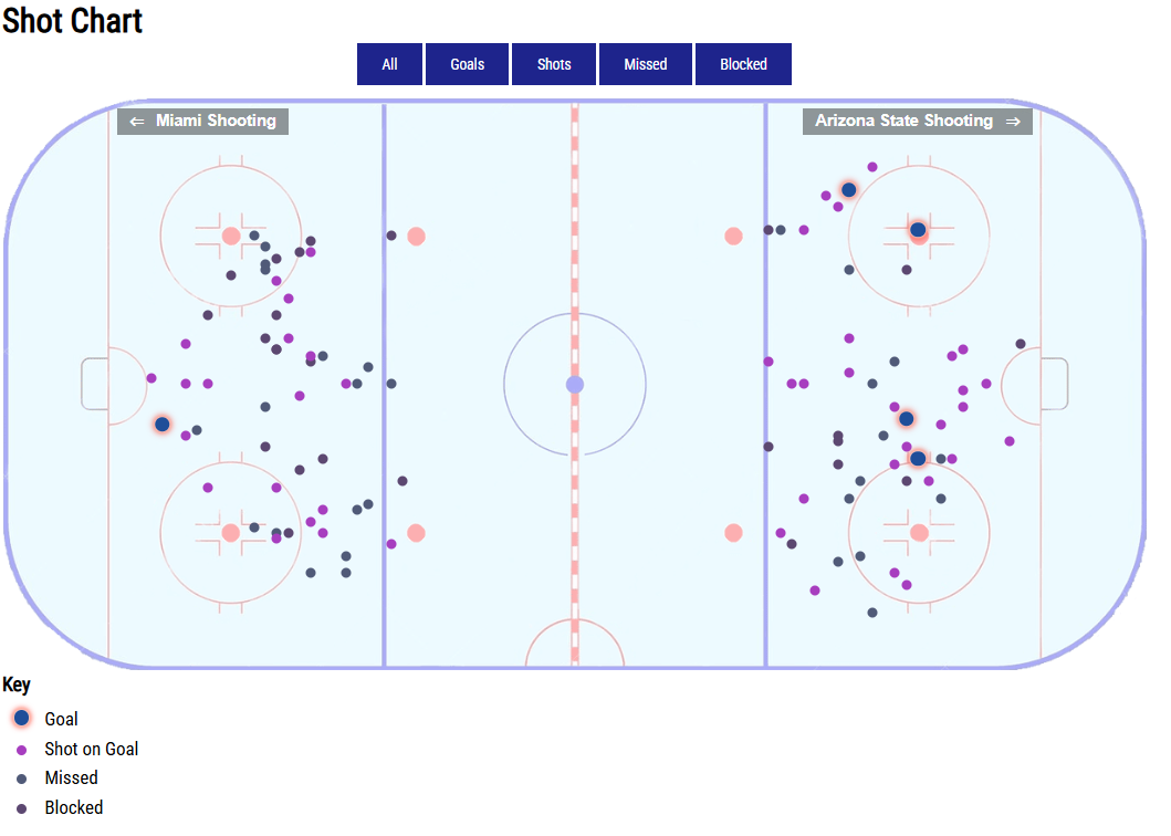 According to the College Hockey News shot chart, Arizona State finished with 30 shots on goal compared to Miami’s 20 and had more high-danger chances from the slot throughout the night.