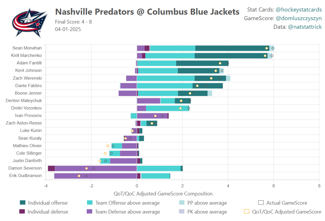 The Columbus Blue Jackets took care of business at home against the eliminated Nashville Predators on Tuesday night, doubling them up in an 8-4 win. Kirill Marchenko scored three goals for his third career hat trick and added an assist for a four-point night, while Sean Monahan also had four points with two goals and two assists of his own.