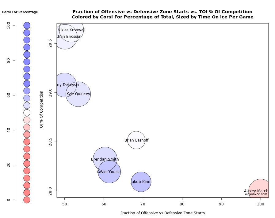 Being paired with Danny DeKeyser has helped Quincey become a more reliable defenseman. As you can see in the chart from War on Ice, Quincey’s Corsi For percentage is greater than 50 percent at even strength while facing fairly high quality of competition and ranking in the top four on his team in defensive zone starts.