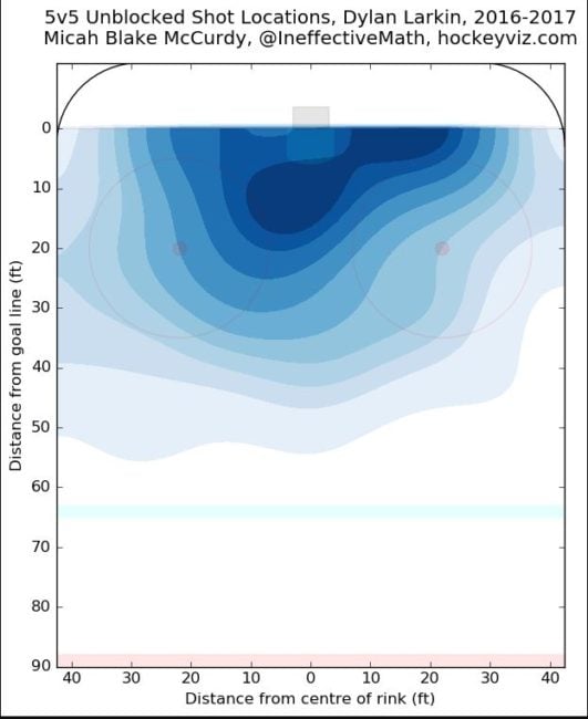 Larkin’s concentration of shots in 2015-16 were more centered in front of the net below the hash marks, whereas this season, the concentration starts to creep above the hash marks as well as off to the right side of the net in a low-scoring area.