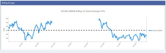 Below is the 15-game rolling average of Larkin’s shot attempts for the past two seasons. As you can see, Larkin started to drop right around the All-Star break last season but finished strong toward the end of the season. This season, he kept his head above water until about December and was never able to get above the 50 percent mark for the remainder of the season.