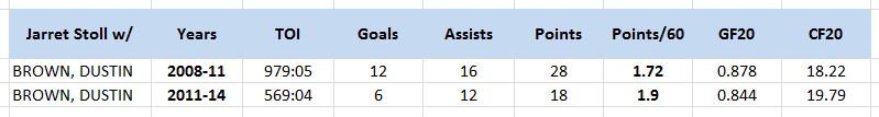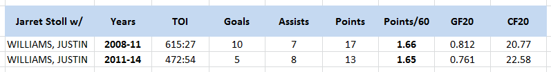 Hmm…he performed more or less as well with Brown and Williams in these supposed years of struggle. Then consider Stoll’s dismal .544 Points/60 with Lewis, once again, his most regular linemate from 2011-14.