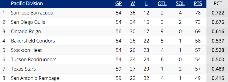 The Barracuda still are at the top of the AHL’s Pacific Division table both in points (78) and winning percentage (.722). If the playoffs started today, San Jose would face the Bakersfield Condors in the opening round.