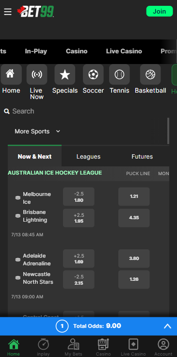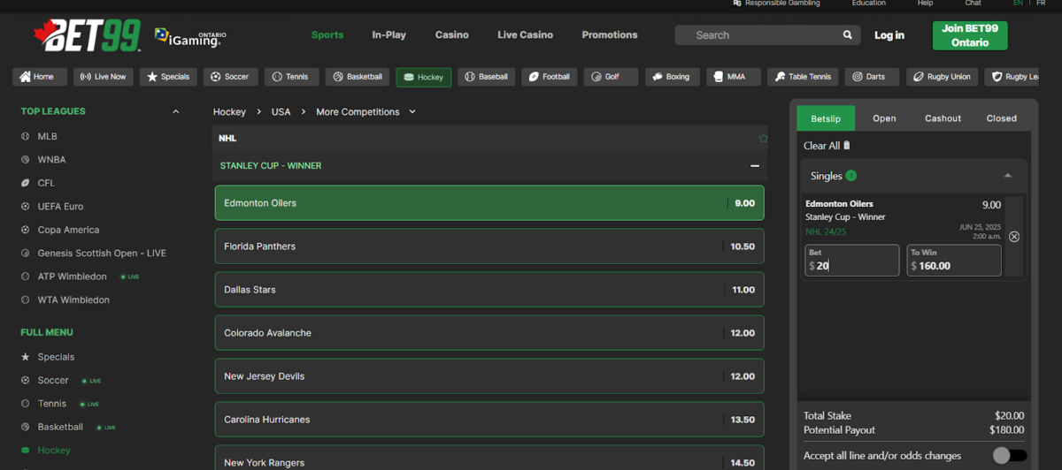 From there, consider the type of betting you’re most interested in. If you’d rather play the long game, Sports Interaction is a great option for futures betting, while those who would rather make complex same-game parlays should consider Bet365. Sportsbooks like Bet99 are great for hockey bonuses, like parlay boosts and specials.