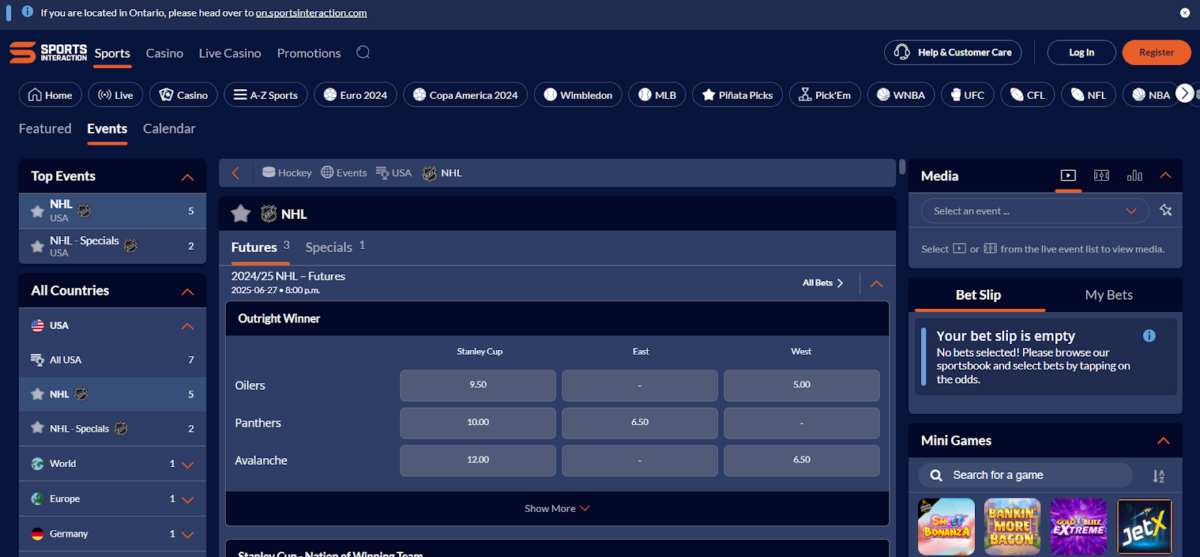 Sports Interaction has a more diverse futures betting market than many other best NHL betting sites. This is great for fans itching for summer to be over and hockey to return.