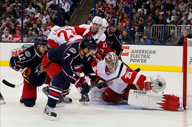 The home opener vs. Detroit hit on very similar themes to those found in Nashville, only with the variations you would expect for Game Two after a six-day training camp. While some characterized the Blue Jackets’ play over the first 30 minutes as “flat”, that’s not what I observed. I saw a well coached Red Wings team, still smarting from the 6- 0 shellacking from the Blues, using their skating ability to exploit the fact that Columbus was fielding a large number of new faces. While Nashville exerted a moderate forecheck in Game 1, it was easily defeated through some quick exit passes. Not so with Detroit. The Wings’ forecheck was tenacious, not providing room to breathe, let alone move or pass. For guys that had not played together, this kind of pressure generates uncertainty, which in turn breeds hesitation. Hesitate against Detroit, and you are in for a long evening. Such was the case for the first period and a half against the Red Wings. That the first period ended in a scoreless tie was attributable primarily to the theatrics of Bobrovsky, who quite literally stood on his head at one point to make a flailing save.