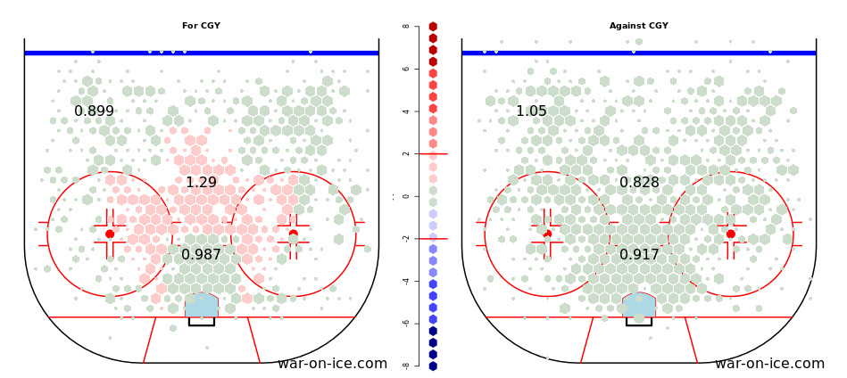 The below hextally chart shows the Flames taking fewer than the league average number of shots from every region of the offensive zone (left side), especially in that high shooting percentage area right in front of the net. The other half of the chart shows the Flames giving up more than a league average number of shots in every section of the defensive zone. 1.1 in the high risk area and 1.22 in the medium risk zone are particularly troubling numbers for the team.