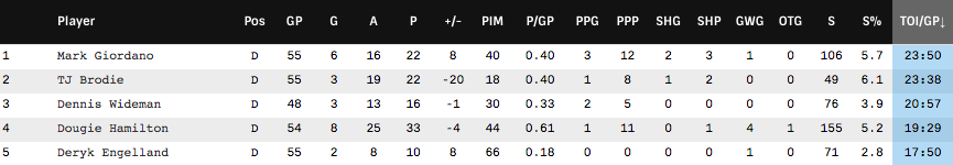It does not take an expert to see that Wideman is struggling in nearly all facets of the game, and yet he still averages over 20 minutes per game. Over the course of the year, in fact, Wideman is third on the team in average ice time – even ahead of Dougie Hamilton.