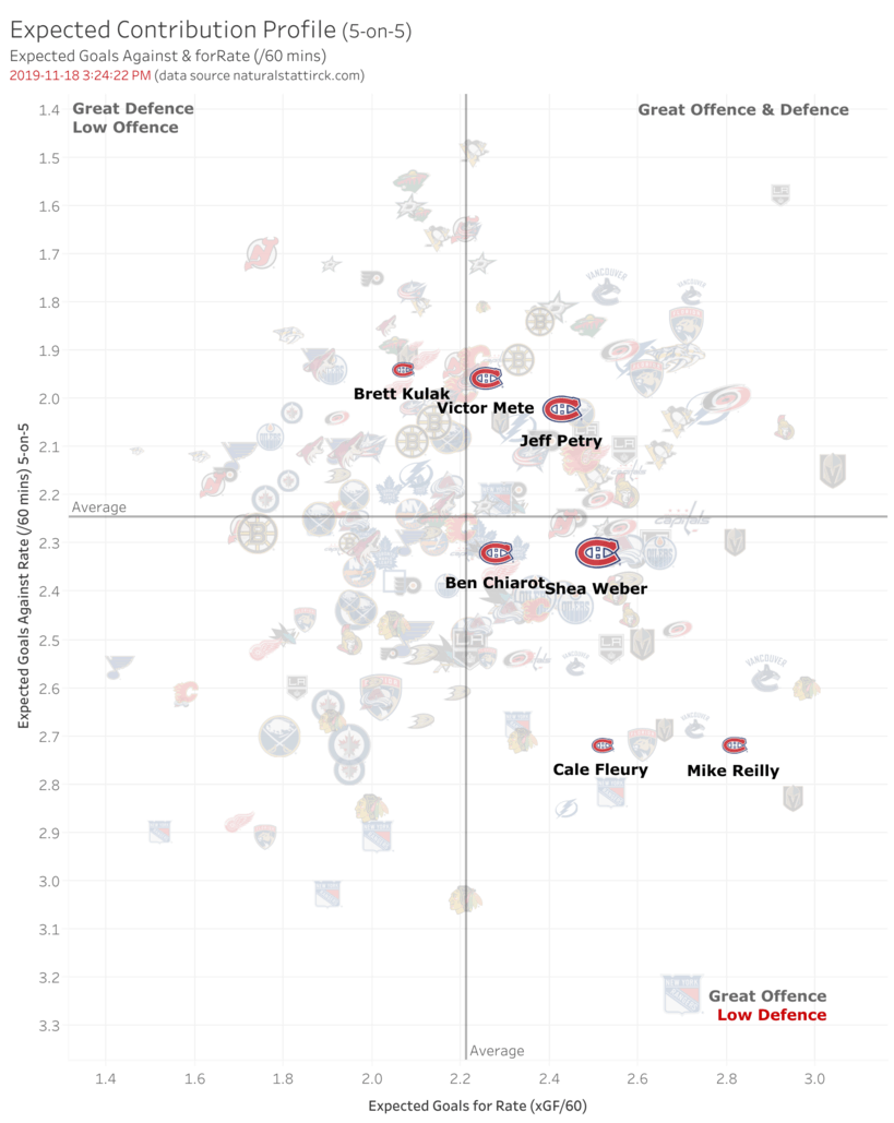 When Chiarot is on the ice, the Canadiens enjoy over 53% of the shot attempts share and a very low 1.98 goals against rate (per 60 mins). It’s easy to see on this graphic that most of the Canadiens’ defencemen are in good company.