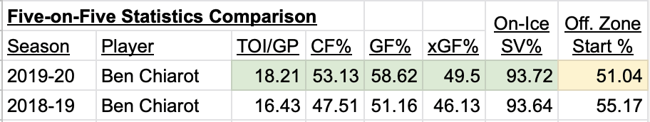 As highlighted in green in the chart above, Chiarot has seen an increase in ice time per game by almost two mins. His possession numbers are way up from 47.51% of shot attempts (CF%) to 53.13%. Both his goals for and expected goals for shares are up dramatically. It’s also interesting to note that his on-ice five-on-five save percentage (93.72%) is similar to last season (94.64%), and that his usage is more difficult this season, with his offensive zone starts (51.04%) down from last season (55.17%).