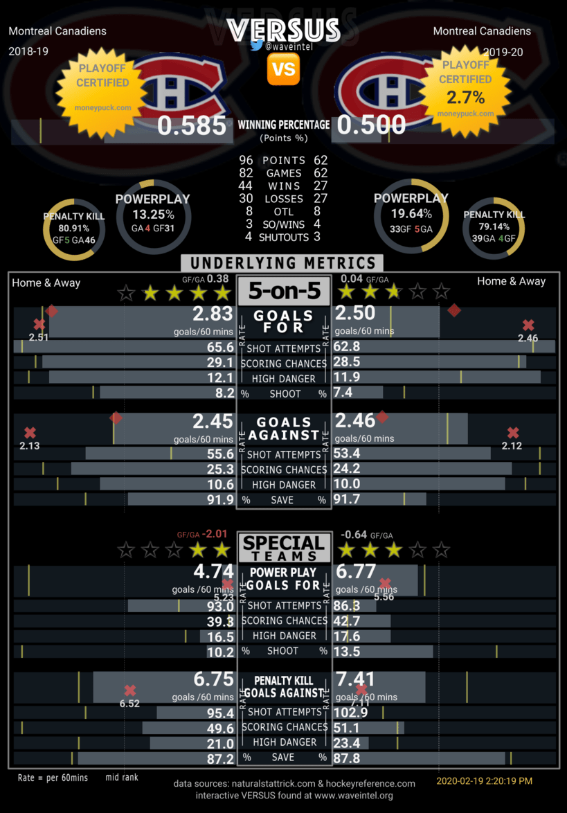 A quick analytical assessment of the Canadiens using WaveIntel’s VERSUS tool shows, per the graphic below (last season on the left), what we already know: the Habs are a pretty strong five-on-five team, but their ability to convert chances into goals is not especially good.
