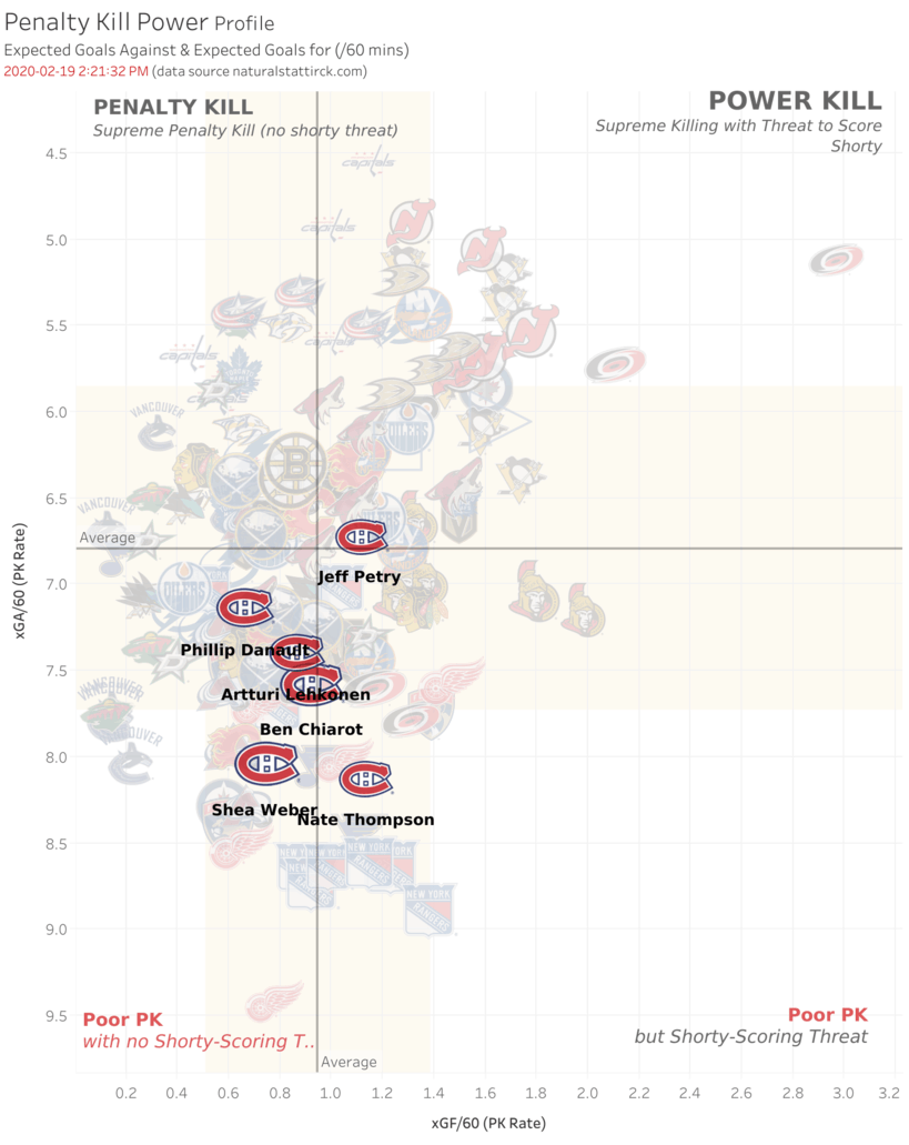 The chart above is essentially a scathing assessment of the Canadiens’ penalty-killers. It uses the expected goals metric to assess their ability to suppress chances against (y-axis) and generate chances for (x-axis). Defenseman Jeff Petry is performing above average on both sides; suppression and chance creation. What’s alarming is the performance of players considered to be defensive specialists: Shea Weber and Nate Thompson. They are not only below average for suppressing chances against, they are outliers in negative terms.
