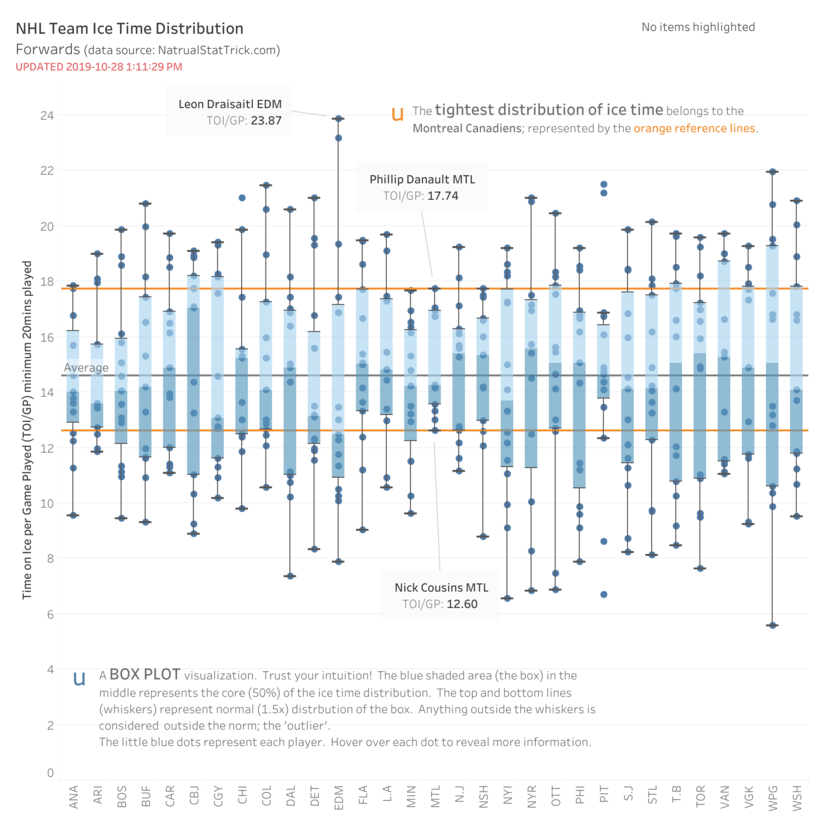 Without knowing anything about Box Plot, the visual graphic below tells the story. The Canadiens are the smallest vertical bar near the middle, highlighted in yellow on the X-axis. I also highlighted the Canadiens forwards with the most and least ice time per game: Phillip Danault with 17:74 time on ice per game (TOI/GP) and newcomer Nick Cousins 12:60 TOI/GP. I also added two orange reference lines at the top and bottom of the Canadiens’ ice time distribution for easy comparison to other teams.