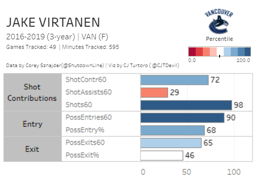 Virtanen has steadily improved his play-driving abilities. As the data from the All-Three-Zones project shows, he generates shots and can get the puck into the offensive zone at an elite rate.
