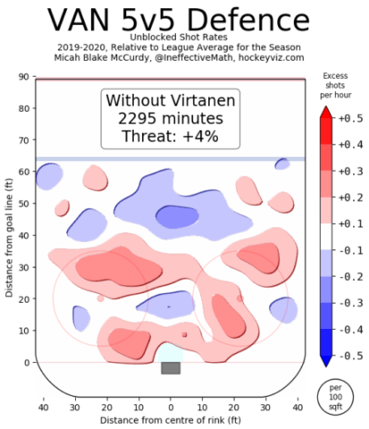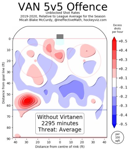 The Canucks bleed shots and scoring chances with Virtanen on the ice at even-strength, fairing much better when he is on the bench. He is only on the ice for 45.70% of scoring chances but is actually outscoring opponents 30-29. This points to Virtanen getting a little lucky – he should be scoring less than he is.