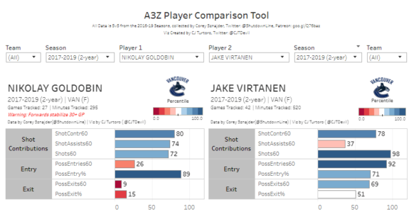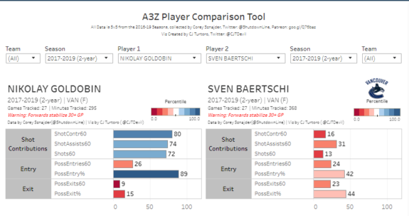 Baertschi and Goldobin look relatively equal here, but Goldobin has actually been the better 5-on-5 play-driver, generating more expected goals and shots. The A3Z tool paints an even stronger picture of Goldobin’s impact.