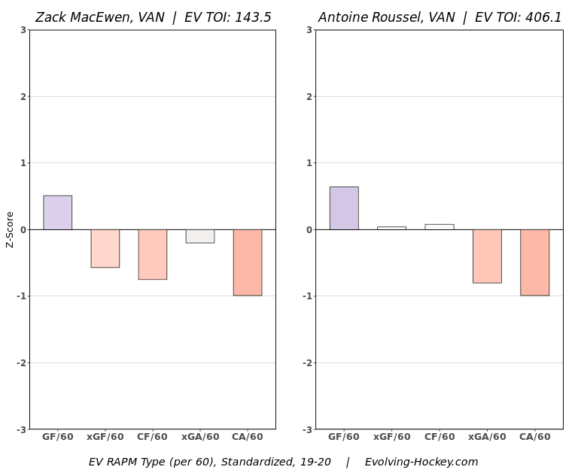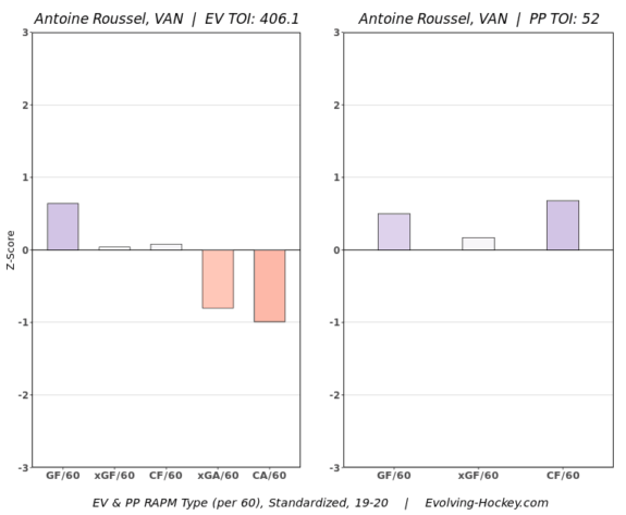 Roussel was very effective in his first season with the Canucks, providing strong even-strength defence while contributing offensively. This season, his numbers have nearly reversed. He’s provided far less offence while having a negative defensive impact.