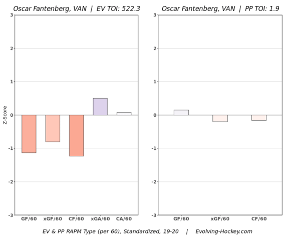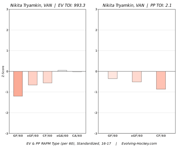 In his brief NHL stint, Tryamkin essentially performed akin to a bottom pairing to replacement-level defender. Honestly, he didn’t perform much better than Oscar Fantenberg did this past season. They scored relatively similarily in shot and scoring chance metrics, with the latter having the defensive edge.