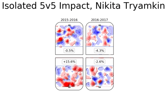 Tryamkin definitely needs to work on his defensive game. The opposition generally didn’t have a difficult time getting to the front of the net for grade-A scoring chances when he was on the ice. The top two charts are his offensive shot locations, while the bottom two show his defensive impact.