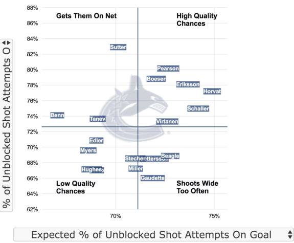 Once again, the top left portion of the graph contains the players who produce a higher amount of unblocked shots on goal than their expected amount – resulting in the highest quality chances. This shows Pearson makes 80.17 percent of his unblocked shot attempts on goal while only being expected to have 72.7 percent of shots to be on goal.
