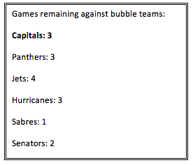 In the final nine games left in the season the Caps need to reach that magic 91 point mark that is believed to guarantee a playoff berth this season. As it stands the Caps are on pace to reach 90 points. Even if they can clinch those six wins, anything can happen. What’s fortunate for the club is they are still in control of their own destiny, playing three games against teams in the running.