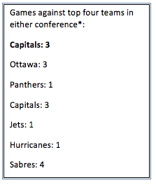 These are the must-win games for the Caps, who need to rob their competitors of two points each night to avoid feverously watching the out-of-town scoreboard to determine their playoff fate. And to the chagrin of the other teams, all will be played at the Verizon Center. In fact five of the final stretch games are at home in a building that has been kind to the Caps this season. The Jets, who have been notoriously dominant at home, only have three home games of their remaining nine. The Caps have gone 23-10-3 at home this season making them the best fourth-best at home in the conference.