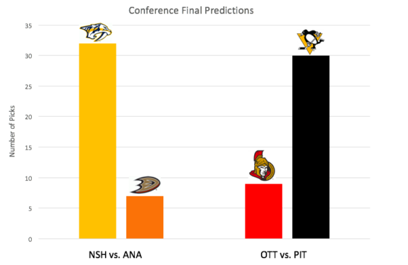 The Eastern Conference Final will consist of a matchup between the Ottawa Senators of the Atlantic Division and Pittsburgh Penguins of the Metropolitan Division. The Western Conference Final will be between the Nashville Predators of the Central Division and the Anaheim Ducks of the Pacific Division.
