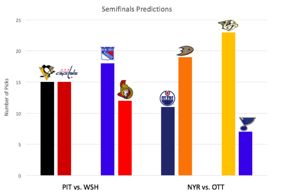 Starting with the Eastern Conference, the majority of us had selected the New York Rangers to defeat the Ottawa Senators (18-12), while we were equally split on the Washington Capitals–Pittsburgh Penguins series (15-15). Of the 12 of us that predicted the Senators to win, five of us correctly picked the series length of six games (Will Billinghurst, Andrew Forbes, Judson Rempel, Shane Sander, and Jeff Hawkins).