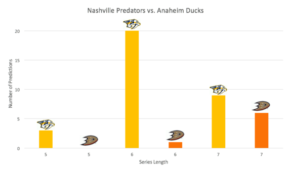 Our predictions favor the Predators 32-7, but the majority of us believe that this series will take at least six or seven games for either team to be victorious. The majority of us (20) predict that the Predators will win this series in six games.