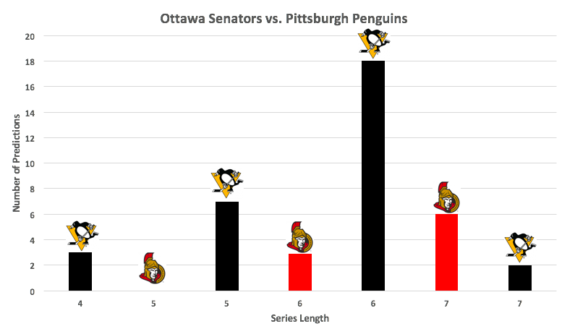 With all of that considered, our final vote is 30-9 in favor of the Penguins. We did underestimate the Senators in the last series, but there is a more overwhelming support for this series for the Senators’ opponent than there was in the last. The prediction that has the most support is the Penguins winning in six games, with a count of 18 votes.