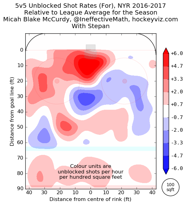As you can see in the graphs above, the Rangers are far and away better in their own zone when Stepan is on the ice, as opposed to when he is not on the ice. While the extremely high-danger shots are still a big problem either way (and that is more on the shoulders of the defensemen than on Stepan, or any of the forwards). The blue zones (the zones that are above the league average) are still abundant when Stepan is on the ice, and nearly non-existent when he is not. He is simply one of the best defensive forwards the Rangers have.