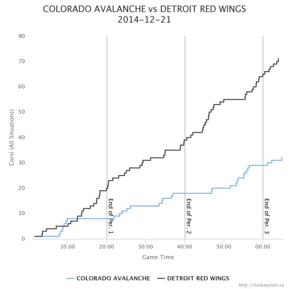 This Corsi chart from Hockeystats.ca shows the Red Wings had 71 shot attempts, with 35 of those actually counting as shots on goal.