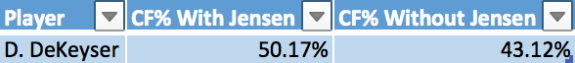 Since making his NHL debut on December 20th, the soon-to-be 27-year-old defenseman played more with DeKeyser than any other partner logging 333:18 of even strength time by his side. The results are staggering with the amount of salvation that Jensen offered to his reeling partner, albeit in a small sample size.
