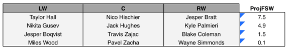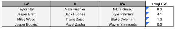 Every team needs a line with some size and edge. Pairing Wood, Zacha, and Simmonds together could give the Devils that. Simmonds would be the smallest player, at 6-foot-2, 185 pounds, but he doesn’t shy away from physical play. All three players can contribute a bit of offense, too. Their 0.1 ProjFSW isn’t great, but they could outperform it if all three players bounce back from tough seasons.