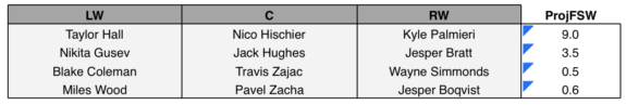 The second line of Gusev, Hughes, and Palmieri screams potential. And it’s no surprise they have the highest ProjFSW of the second lines mentioned here. Palmieri is the perfect fit for Hughes and Gusev. He provides the shooting threat that they need to be successful as they get used to playing in the NHL. If they find chemistry quickly, they could produce first-line scoring rates.