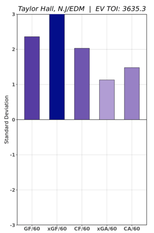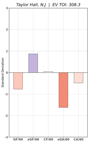 Below are RAPM charts, which show a player’s impact on a stat by stripping outside factors like opponents and teammates, from Evolving Hockey. The one on the left is from 2016-2019, while the one on the right is for this season. The first three columns (GF/60, xGF/60, CF/60) are offensive metrics, while the last two (xGA/60, CA/60) are defensive metrics. The darker orange shows Hall’s negative impact on expected goals against per 60 minutes (xGA/60), as well as a negative impact on shot attempts against per 60 minutes (CA/60).