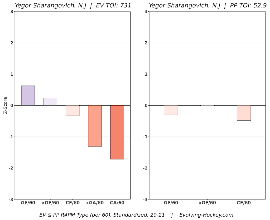 While Sharangovich is not an elite defender, he’s been about a league-average defender and is not having a negative impact in that regard like he was a year ago (chart on the left). His offensive impact has improved quite a bit as well, as he’s gone from about league average impact in CF/60 and xGF/60 to being above league average. Those are the kinds of strides you want to see from year one to year two of a player’s NHL career. It also further validates that his close to last season wasn’t a fluke and more a legit showing of what he can be in a scoring role.
