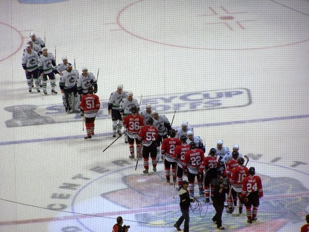 “It’s something all sports fans can appreciate and hockey fans expect. After a long hard fought series comes one of the sports world’s greatest shows of sportsmanship and respect. Players line up to shake hands, putting the pride and integrity of the game and of their franchise above their own. The winning team takes some time to celebrate while the losers simply wait out of respect until the celebration is finished.”