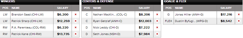 Again please look at the DraftStreet format. There are two C, LW, RW, and D each but there is one goalie and one FLEX position. The FLEX is always an interesting wrinkle and not every daily platform has that.