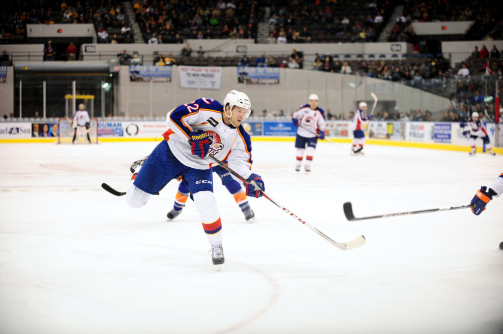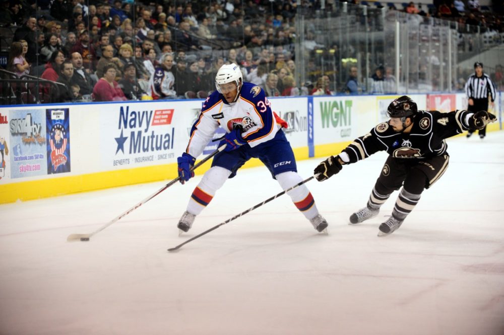 tight” in the beginning of the year until he lit up offensively against the Binghamton Senators November 2nd scoring two goals. Since November 2ndEtem has not let up scoring 9 goals total. The Long Beach native has three 2-goal nights. Norfolk’s head bench boss said, “You can see why he scored 107 points in Juniors.” The 107 points Yawney mentioned was with the WHL’s Medicine Hat Tigers just a year ago. Competiveness runs in Etem’s blood as his parents were Olympic rowers and that’s how they met.