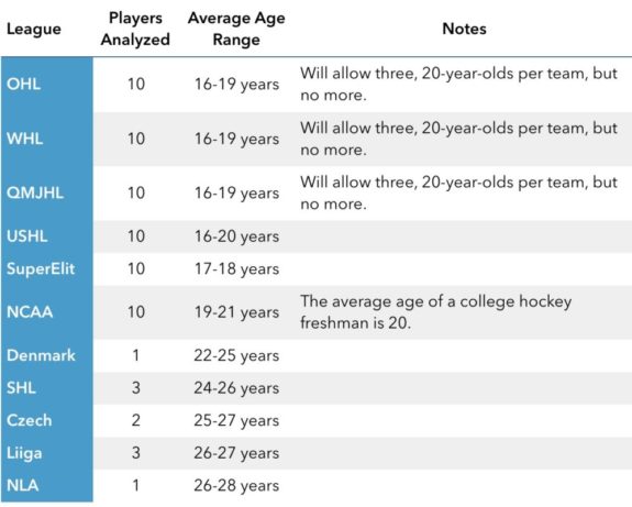 When looking at the data, patterns emerge that can be helpful in determining their capabilities to contribute offensively down the road. It would appear that defensemen developing in European leagues have lower point production rates than defensemen developing in North American leagues. Although point production tends to decrease as the league’s average age range increases (regardless of the country), defensemen developing in the NCAA are still managing to contribute more offensively than defensemen developing in the QMJHL and the USHL.