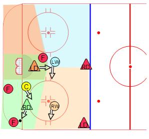 In the diagram to the right, the center (yellow dot) and two defensemen position themselves between opposing forwards and the net when the puck is in their own end. The system often breaks down when the center cheats up ice anticipating a turnover, leaving his man uncovered and his teammates scrambling to recover.
