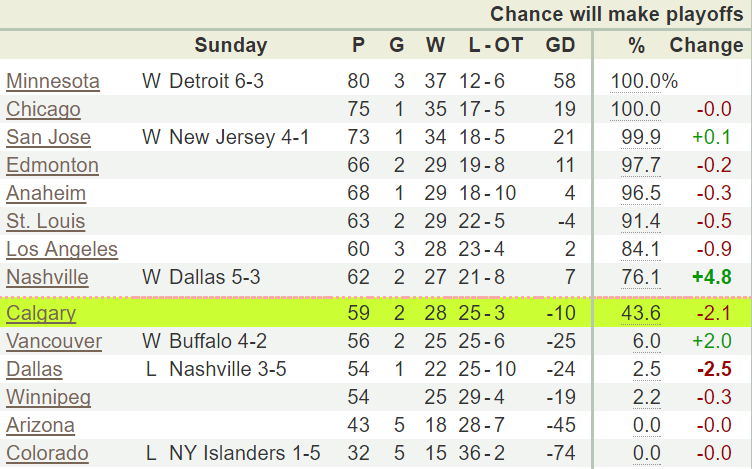 Five days ago, the wild-card race was a tightly contested six-team contest. The Flames were holding onto the last playoff spot by two points over the St. Louis Blues, with the Winnipeg Jets, Vancouver Canucks, and Dallas Stars all breathing down their neck.