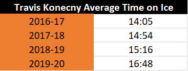 This season, Konecny’s ATOI grew by more than 90 seconds from last season. Based on well he played this season, it is just a matter of time before he joins Giroux and Sean Couturier in the 18 to 20-minute ATOI club. As Konecny gets more playing time, he can expect his offensive numbers to only improve.
