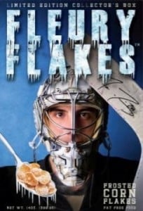 In all things weird and bizarre with the hockey world we now have Fleury Flakes. The Pittsburgh area breakfast cereal featuring – you guessed it Marc-Andre Fleury.