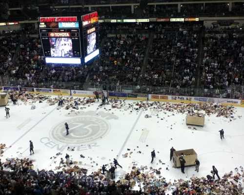 Teddy Bear Toss Night is unquestionably the most exciting event for fans, team staff and players every passing year. About ten thousand fans get the opportunity to toss future toys that will benefit regional charities around the Hershey community. Last season Teddy Bear Toss Night was held on January December 1st, where exactly 12,497 Bears were thrown on the Giant Center ice that evening.