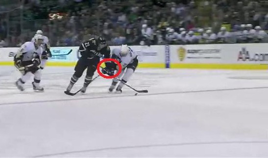 A penalty shot was assessed in this situation because Joe Pavelski was denied a clear scoring chance and the offending Red Wing was the last skater back. You can clearly see the defender grab Pavelski’s hand with his free hand. The restraint is a hold and a penalty.